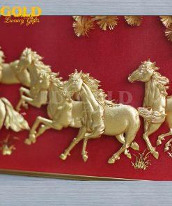 Bức tranh quà tặng “Mã đáo thành công” mạ vàng 24K tái hiện hình ảnh tám chú ngựa phi nước đại một cách đầy mạnh mẽ và sống động. Được chế tác thủ công bởi các nghệ nhân tài hoa giàu kinh nghiệm tại Lux Gold, mỗi chi tiết trong tranh được chăm chút tỉ mỉ từ chất liệu đồng nguyên chất. Sau đó, lớp mạ vàng 24K tinh xảo được phủ lên, mang lại vẻ đẹp rực rỡ, sang trọng, đồng thời đảm bảo độ bền vượt thời gian. Phần nền đỏ nổi bật không chỉ làm tôn lên sự sống động của các chi tiết mà còn góp phần nâng cao giá trị thẩm mỹ, tạo nên đẳng cấp riêng biệt cho bức tranh “Mã đáo thành công”. Sự kết hợp hoàn hảo giữa chất liệu cao cấp, kỹ thuật tinh xảo, và thiết kế đầy ý nghĩa khiến bức tranh trở thành món quà lý tưởng, vừa trang trọng vừa mang nhiều lời chúc tốt đẹp cho người nhận.